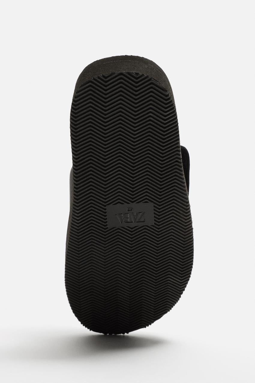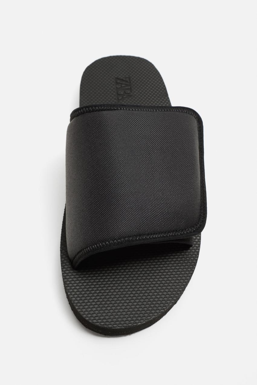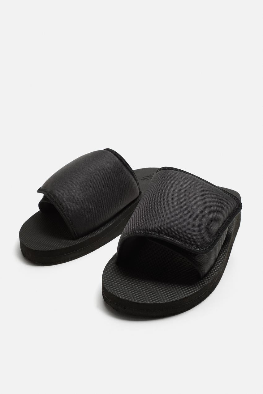 Slider sandals. Padded instep with hook-and-loop fastening for a better fit and comfort during use. Slightly chunky sole in the same colour as the upper.