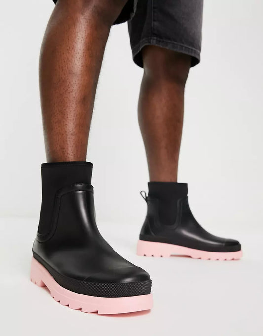 CHELSEA WELLINGTON BOOTS IN BLACK WITH PINK CONTRAST SOLE